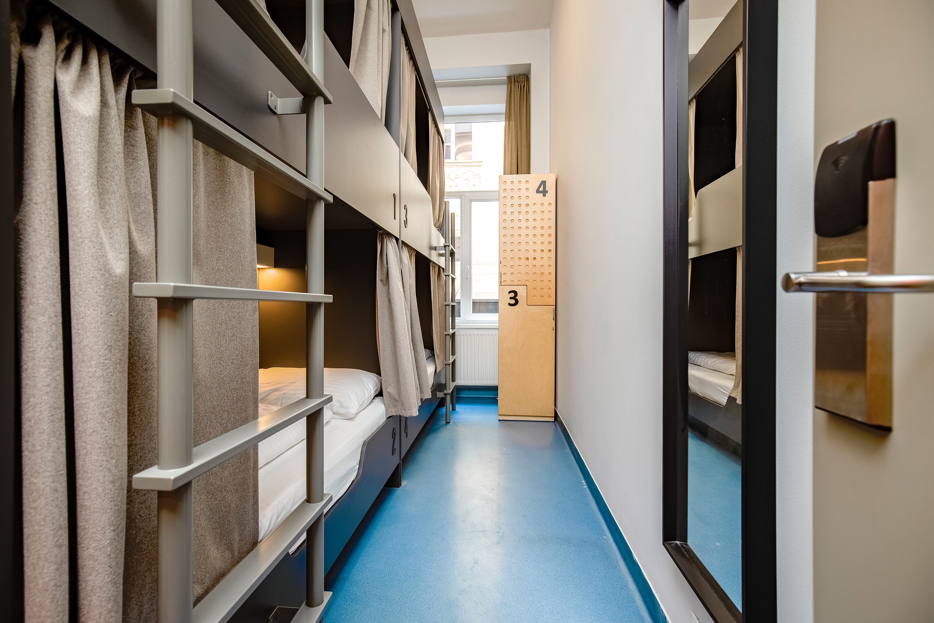 A comfortable shared space for women, offering privacy through custom-built pods with curtains, outlets, and reading lights. Lockers, air conditioning, and fresh bedding are all included. Shared bathrooms are clean and stocked with hot water and hairdryers.